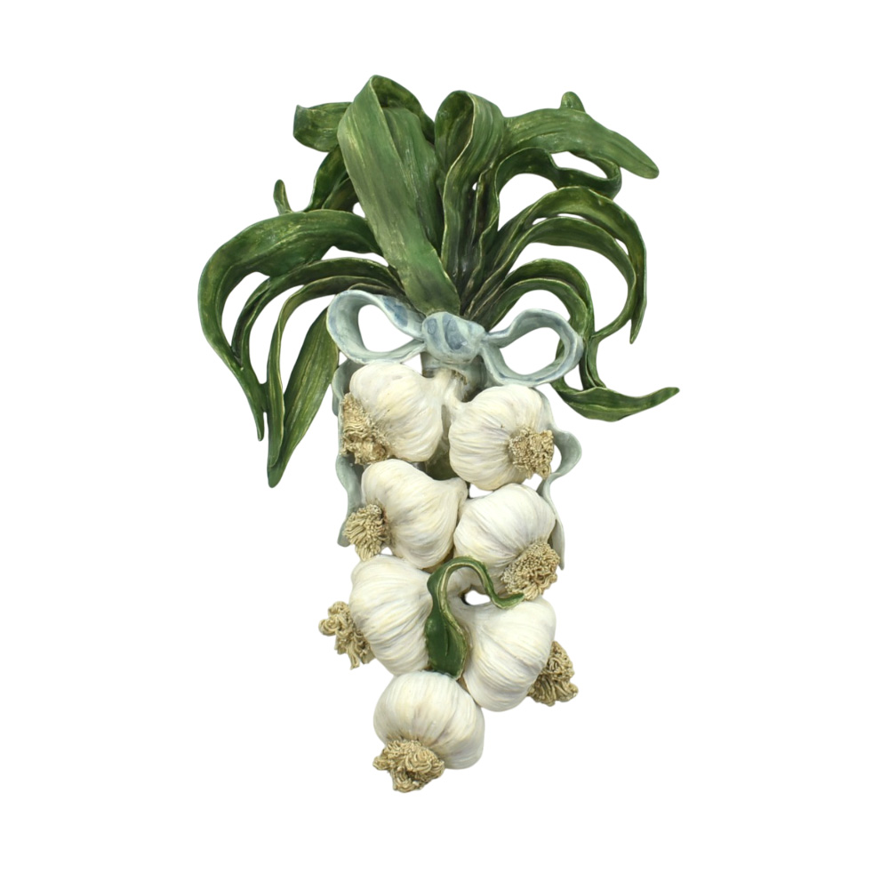 Peça super charmosa para decorar a copa, a cozinha: réstia de alho com laçarote azul listrado, toda em cerâmica