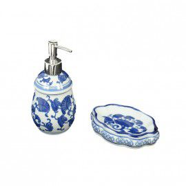 Para dar aquele charme no banheiro ou no lavabo com nosso conjunto de saboneteira e dispenser de hidratante/sabonete líquido em azul e branco! Um clássico!