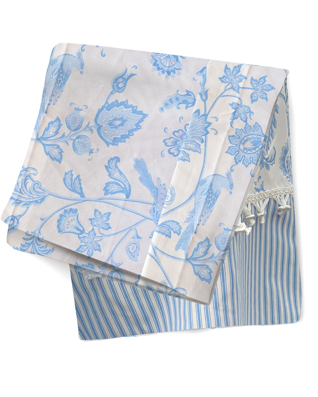 Linda toalha de mesa com estampa clássica toile de jouy em azul claro e barra com babado de listras, um charme!