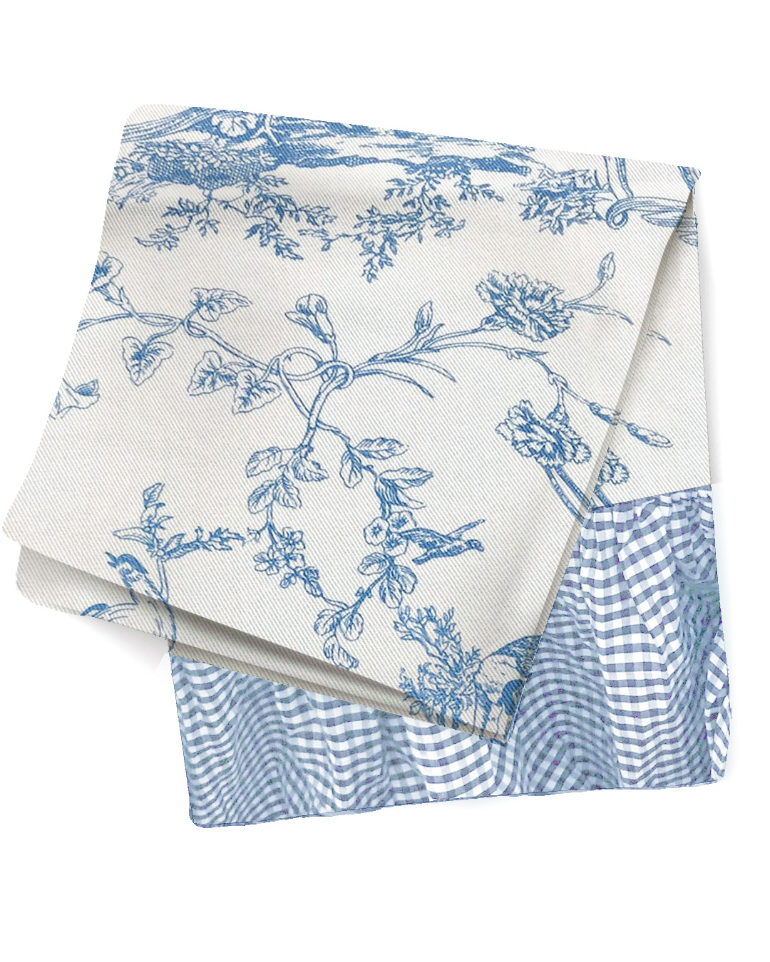 Linda toalha de mesa com estampa clássica toile de jouy em azul e barra com babado em vichy, um charme!