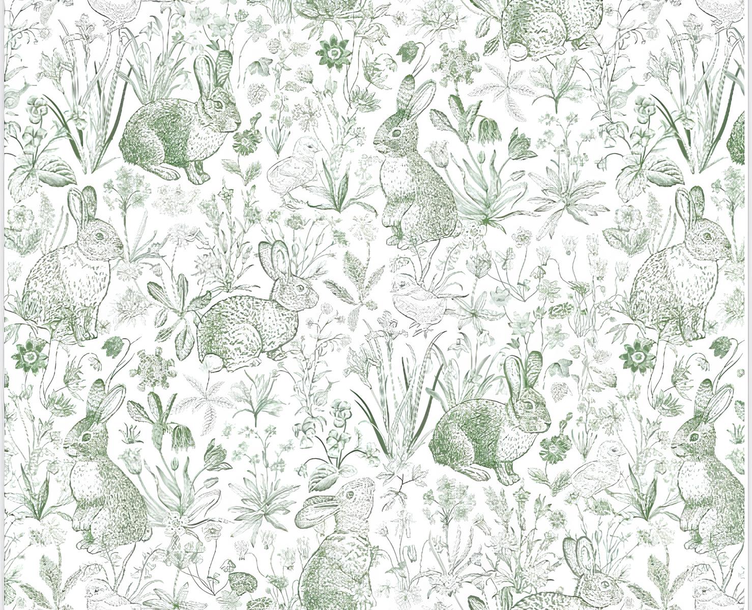 Um charme para a mesa de Páscoa: toalha com estampa de coelhos e flores em verde claro e branco