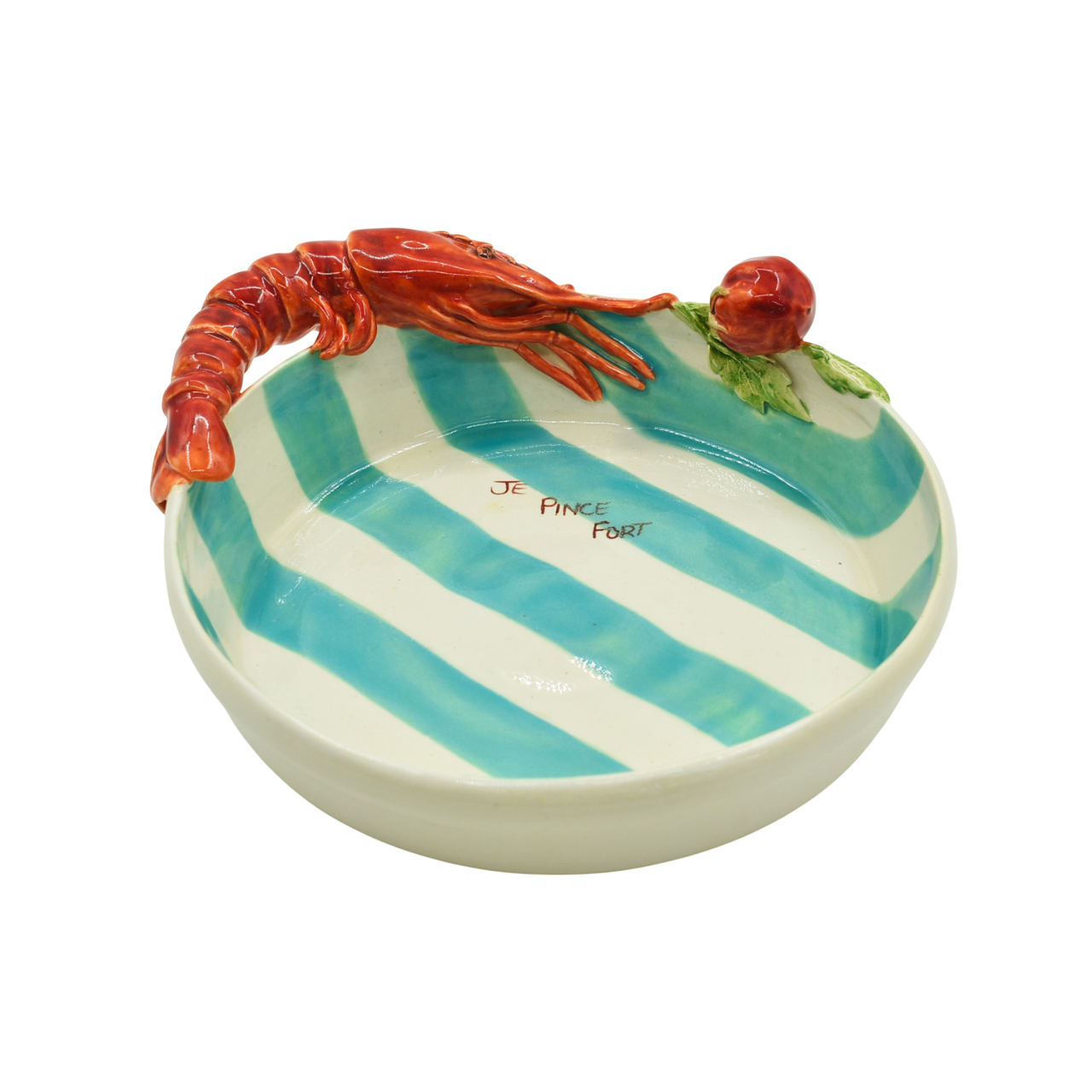 Linda travessa redonda com listras em turquesa e aplique de lagosta e tomate em vermelho