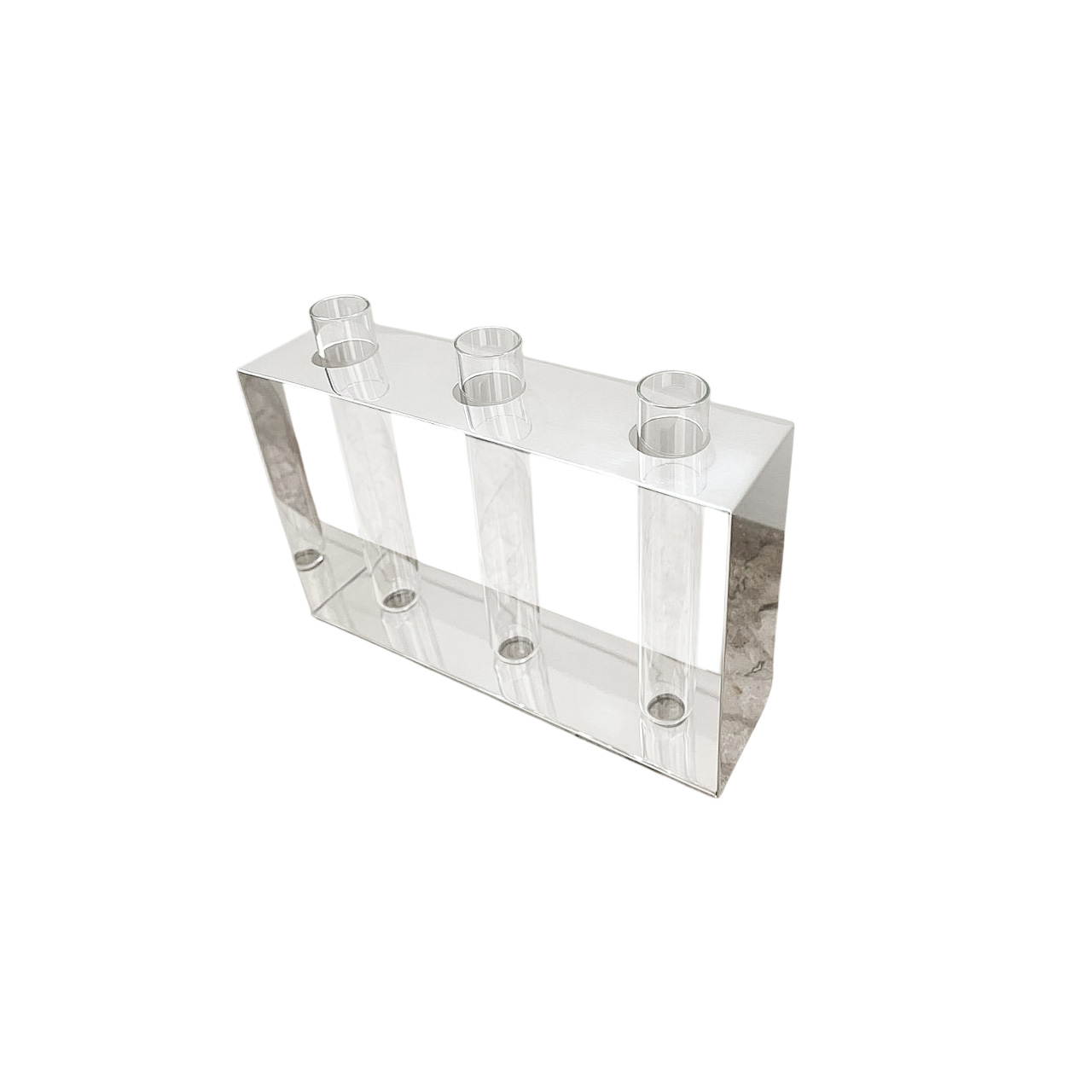 Delicadeza para os arranjos com esse trio de vasos feitos em tubo de vidro e com suporte em prata