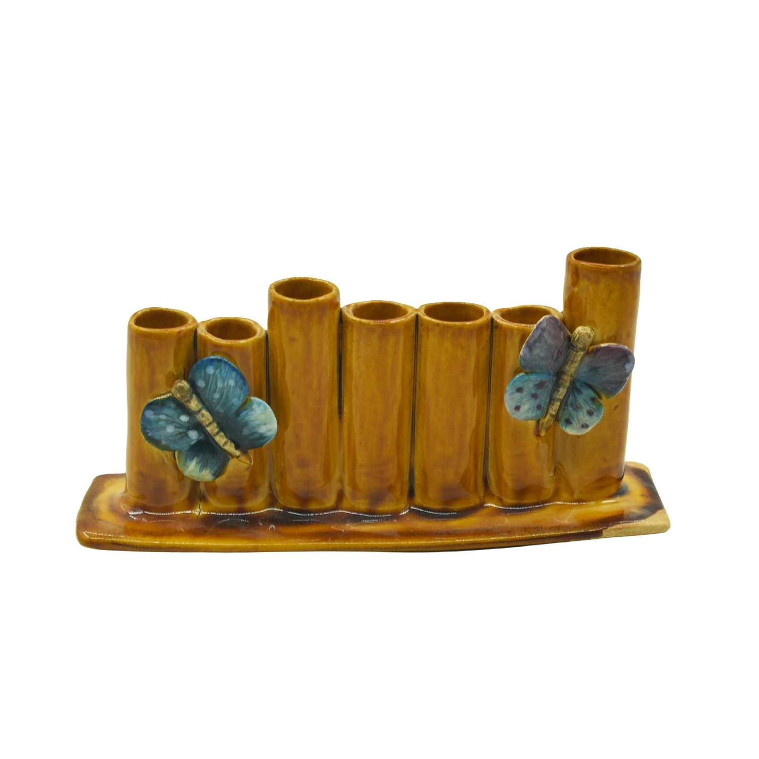 Uma graça de vaso em formato de canudos, na cor mostarda, e borboletas e joaninha aplicadas