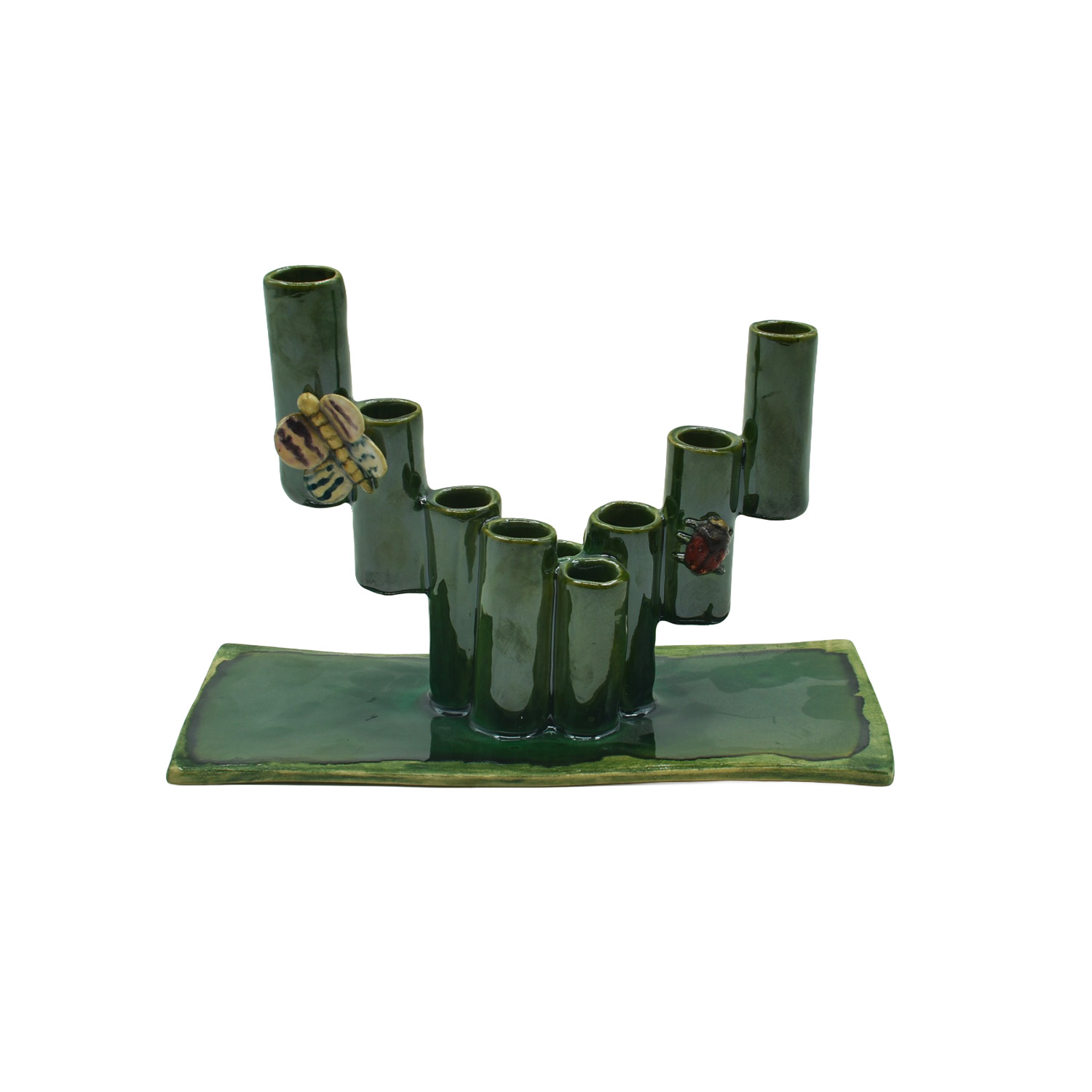 Uma graça de vaso em formato de canudos, na cor verde, com borboleta e joaninha aplicadas
